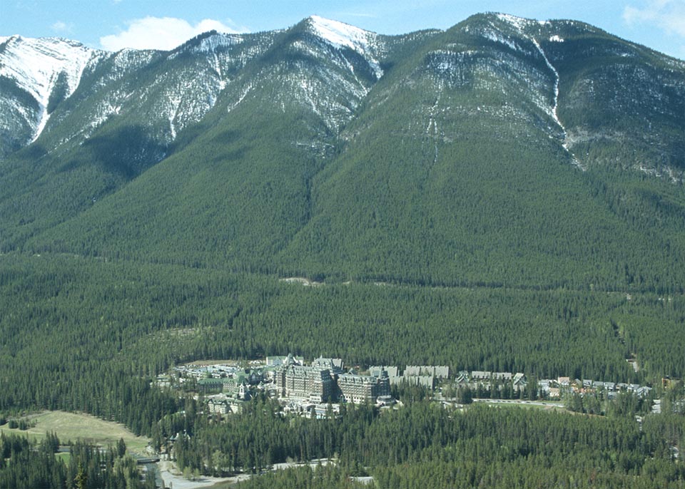 The northeast slopes of Sulphur Mountain showing the Banff Springs Hotel and the paths of ~1880s fires burning in patches of forests previously scorched several times in the 1700s and 1800s.