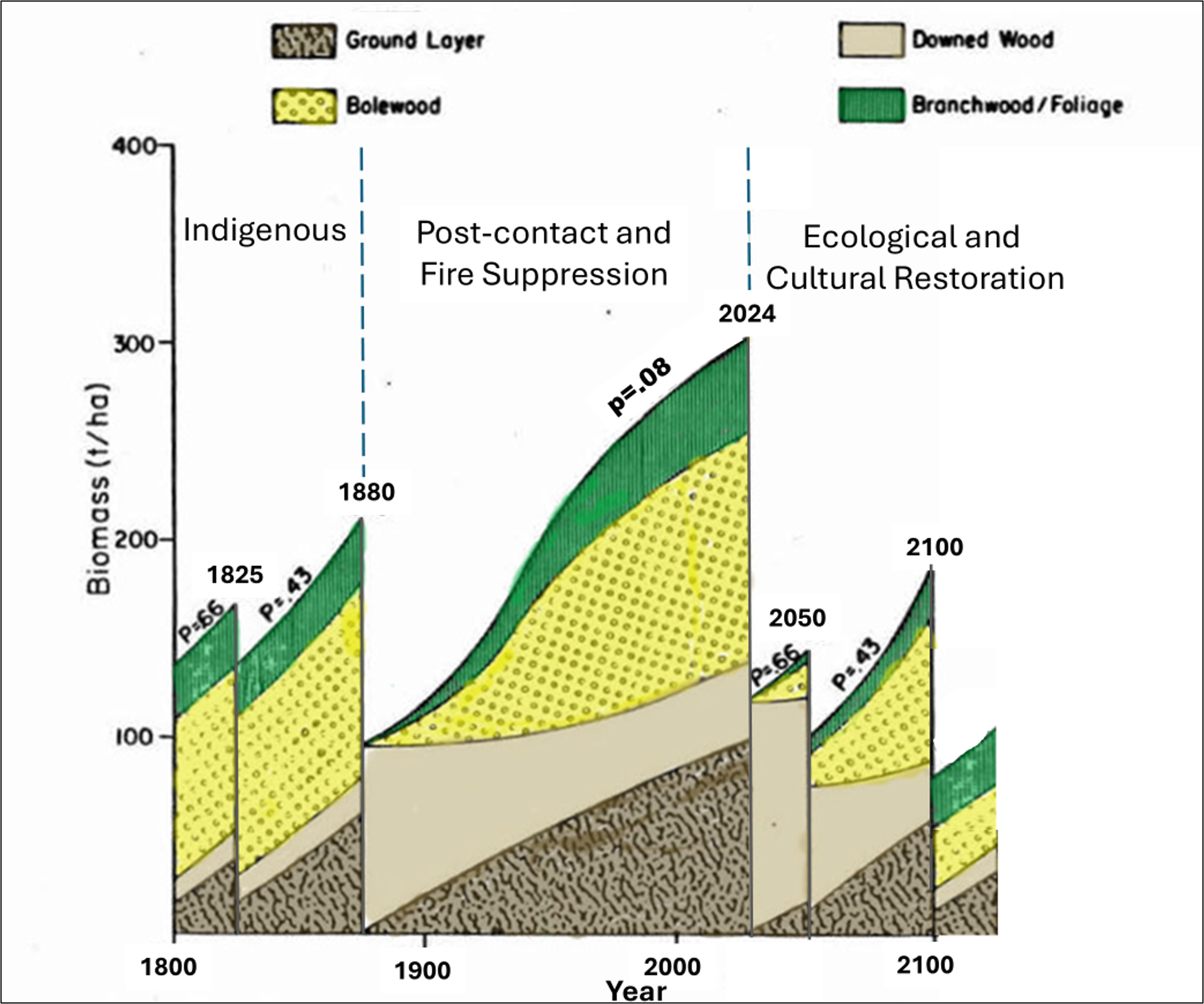 A biomass scenario for the Athabasca Valley south of Jasper townsite with a ~60 year fire cycle prior 1880, post-contact and fire suppression from 1880 to 2024, followed by potential restoration of a long-term fire cycle near the town. This restoration would gradually reduce the massive pulse of dead and downed wood created by the intense 2024 fire (~100 tons/ha) and favour grasslands, riparian shrublands, aspen, young lodgepole and mature Douglas-fir with low downed wood and forest floor biomass. The “p” values indicate the probability the fire interval would be at least as long as shown.