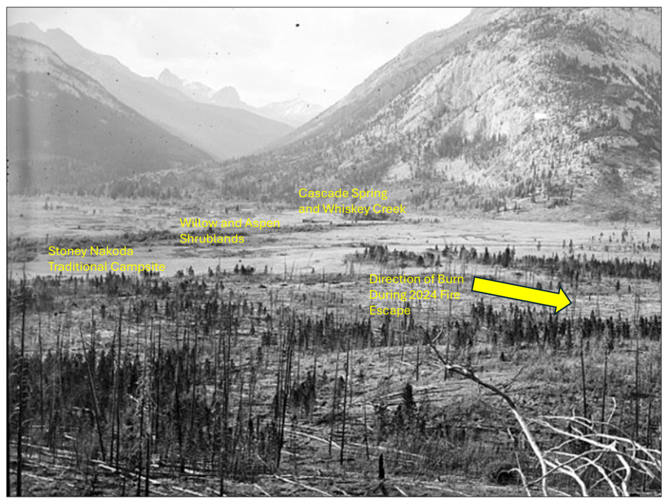 Of course, in past times these larger fires posed little risk to a thoughtfully placed Indigenous camp and were simply part of the ecological and cultural mosaic. In fact, as shown in the historic image below, the traditional Stoney Nakoda campsite location in the meadows may reflect these considerations.