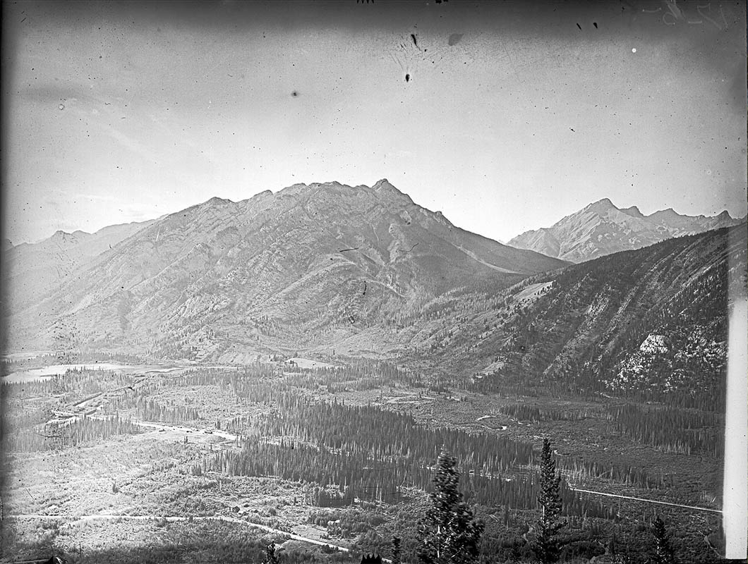 View of Mount Norquay and the Town of Banff in 1888 and in 2008. Prevailing SW winds and ecological and cultural conditions at the convergence of the Bow and Spray watersheds created historical high fire frequencies and open forests, shrublands and grasslands that burned with low to moderate intensity. The modern landscape, dominated by dense conifer forests will burn will burn with high intensity. (Photo credits: McArthur, J.J. MLP-e002506995-v6, MLP-B0002604).
