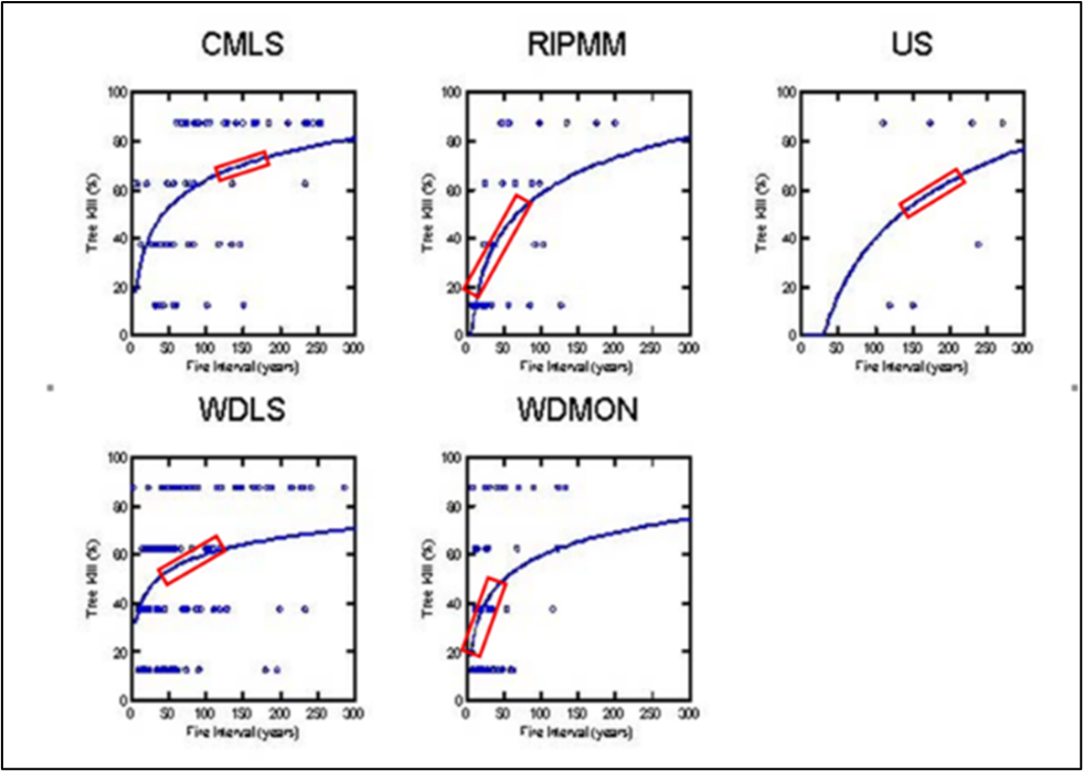 Five of the vegetation groups are predominantly conifers, and these tended to burn with intensities reflecting the time-since-fire of the last burn (interval shown with red boxes) as shown below:
