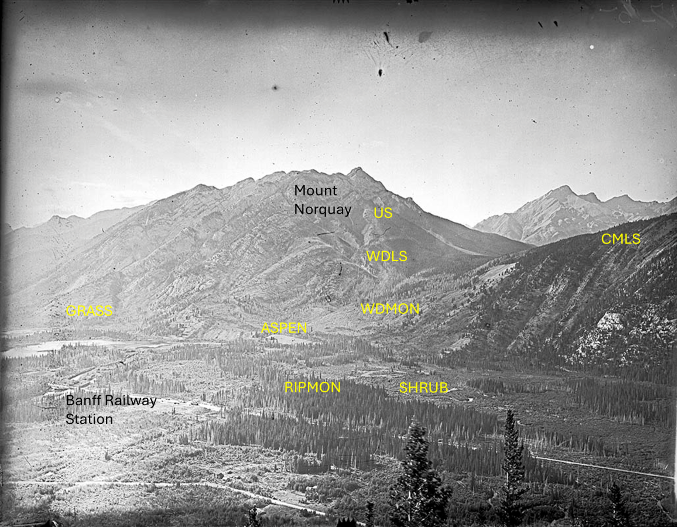 Mount Norquay rises downwind and upslope of the Vermilion Lakes and meadows along the Bow Valley now occupied by Banff townsite. Indigenous people commonly used this area—it lay at the convergence of several valleys with abundant vegetation and wildlife resources. These people frequently used fire, most often in the spring, to lightly burn the landscape and maintain these habitats. This is the “burn early, burn often, burn light” universally used by humans for ecological restoration and maintenance. This fire regime creates a positive feedback loop of vegetation types that in turn favor continued use of low intensity fire in the spring or fall when leaves are cured.