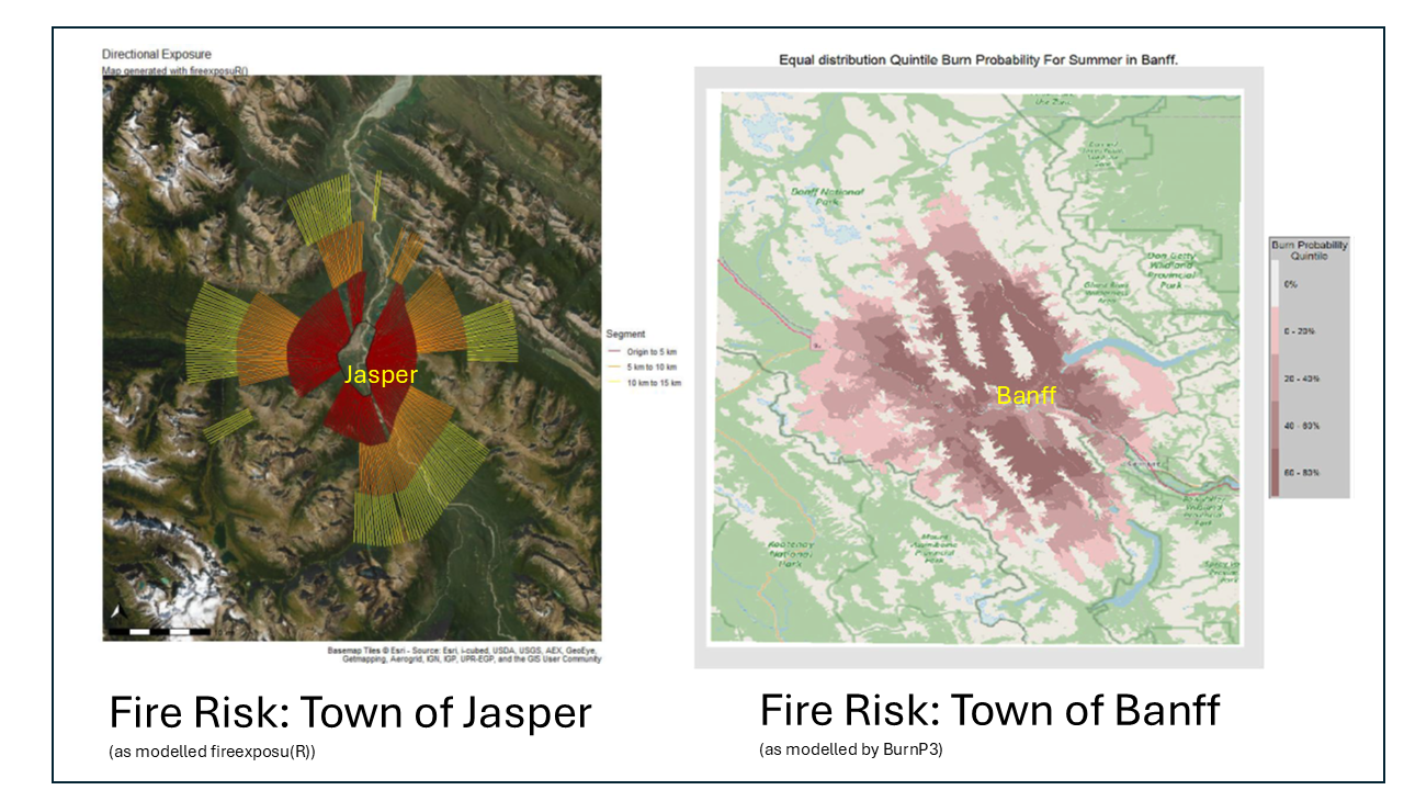 Fire risk from surrounding landscapes to Jasper and Banff townsites as predicted from two different computer modelling approaches. Because many computer modelling and graphic programs ignore or regionally-average wind direction, these should be used with caution. Compare against a local windrose before application!