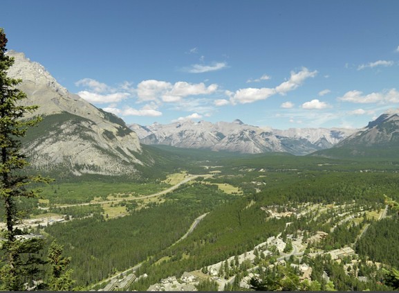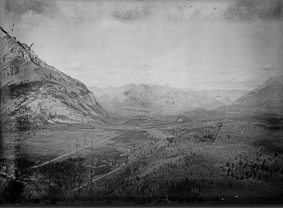 View northeast from Tunnel Mountain across campgrounds and the former meadows near Siding 29 along the railway near Banff townsite (Mountain Legacy Project photographs).