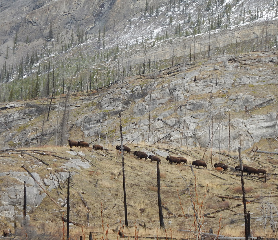 Restored bison in the Red Deer Valley moving upvalley in a movement corridor created by routine prescribed burns.