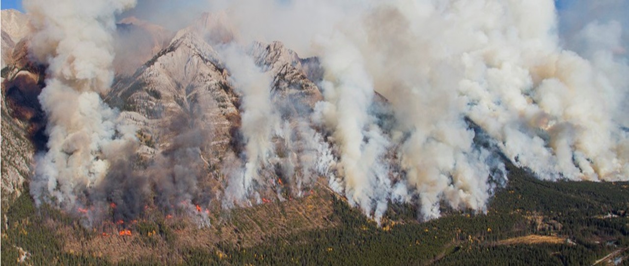 Prescribed burn on the Sawback Range with “Hole in the Wall Mountain” (Mount Cory) in centre, and Bow River and Bow Valley Parkway along the bottom of the photograph. The current parkway follows the route of the historic Indigenous trail (Parks Canada photograph).