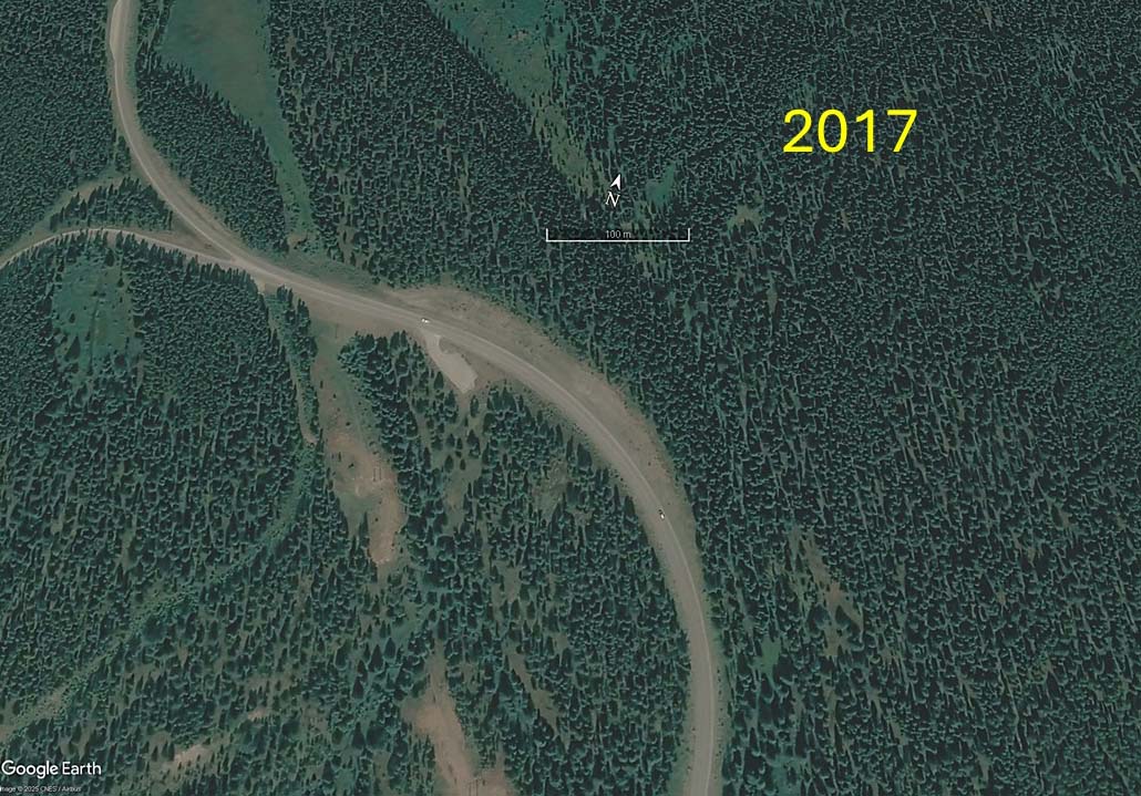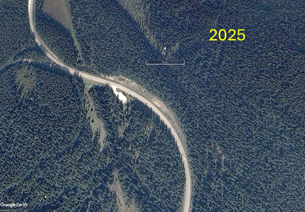 Powerline on Eldon Hill in 2017 during the AltaLink upgrade project and in 2025 as standards for forest screening to protect viewscapes have been applied.