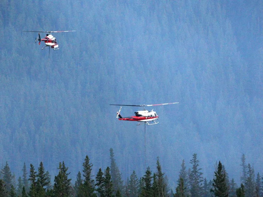 The presence helicopter tour flights and nearby highway gives us good photo-documentation of the rapid and effective initial attack of a wildfire that began in the Trans Canada Highway ditch near Deadmans Flats. The fire spread rapidly eastward though the forest near the highway and a the adjacent AltaLink powerline. Initially, flamelengths were too high for either fire crews or helicopter bucketing to directly suppress. However, helicopter water drops within the powerline, and several well-placed aerial retardent drops flattened out the flames and stopped fire spread upslope into a housing development. Helicopter bucketing and hand crews then extinguished the burn. As always occurs with any event near the Trans Canada, traffic back-ups occured although vehicles could be diverted to Highway 1A on north side of the valley.